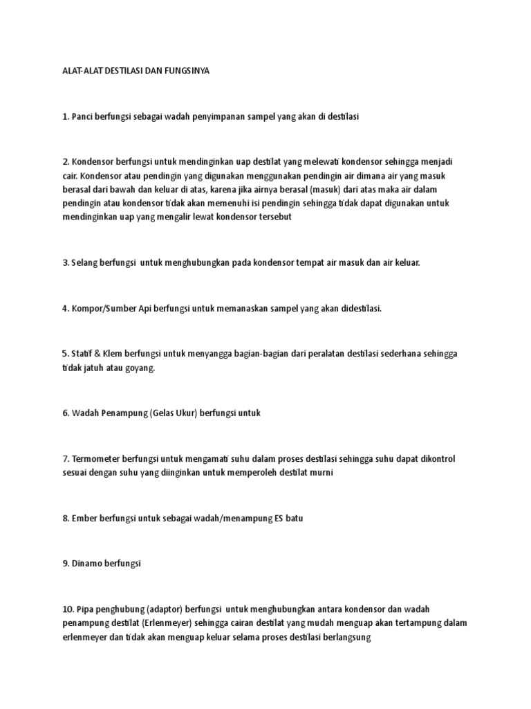 Fungsi adaptor pada destilasi. Metode ini berfungsi untuk proses penguapan pada zat cair tanpa merubah komposisi zat pembentukannya. Fungsi destilasi fraksionasi atau destilasi bertingkat atau destilasi berfraksi ini yaitu memisahkan komponen cair dua atau lebih dari suatu larutan berdasarkan perbedaan titik didihnya. Nah apakah sajakah fungsi dari labu ini. Destilasi juga bisa digunakan untuk campuran dengan perbedaan titik didih kurang dari 20 c dan bekerja pada tekanan atmosfer atau dengan tekanan rendah.